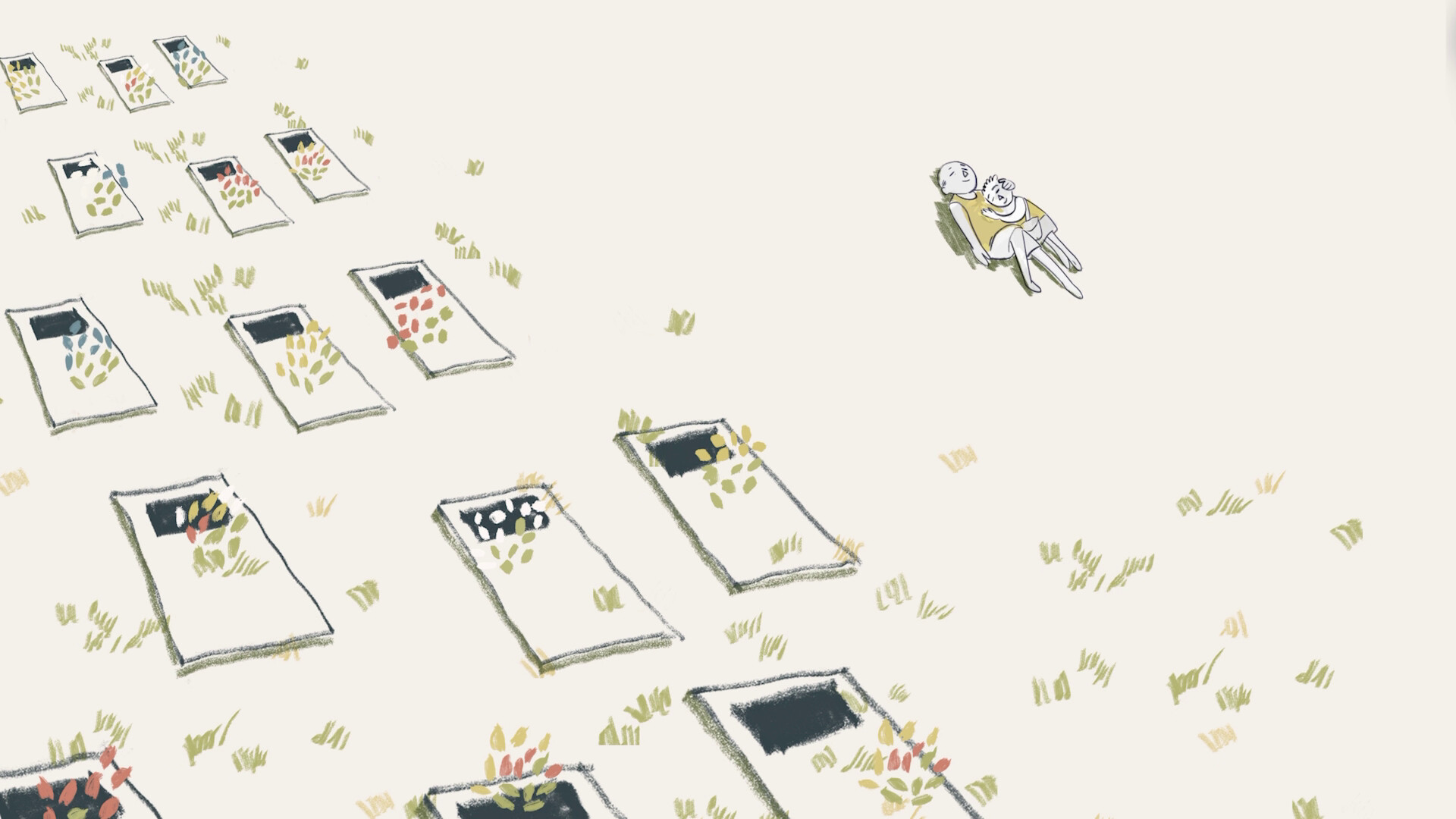 祖父と過ごした、ある午後の遠い記憶。学校に持っていく花を摘むために、古い街並みから高層ビルがそびえ立つビジネス街へと歩みを進める二人。活気ある街の喧騒と、その隣に静まり返る富裕層のための墓地。幼い心に初めて芽生えた階級意識と、今の自分を形作る原風景を、温かなアニメーションで繊細に描き出した9分間の瞑想。